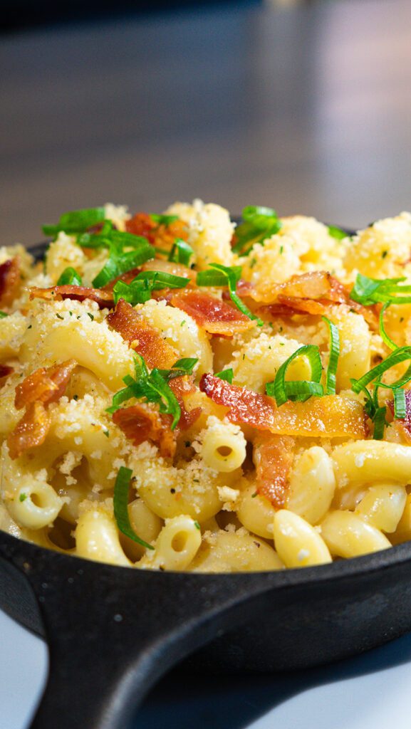Cavatappi Pasta, Mornay Cheese Sauce, Sharp Cheddar, Bacon, Bread Crumbs